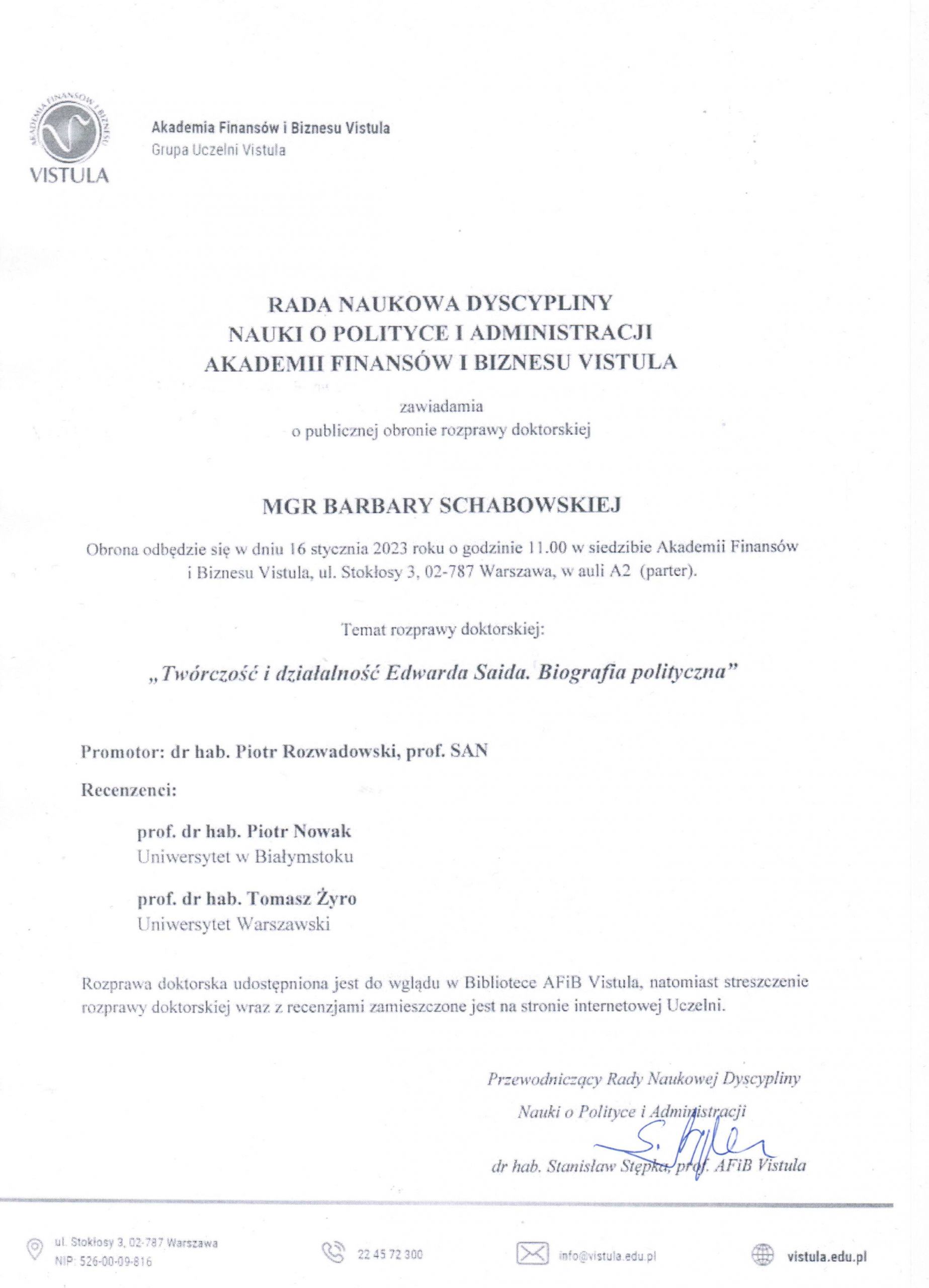 Zawiadomienie o publicznej obronie rozprawy doktorskiej: Pobierz