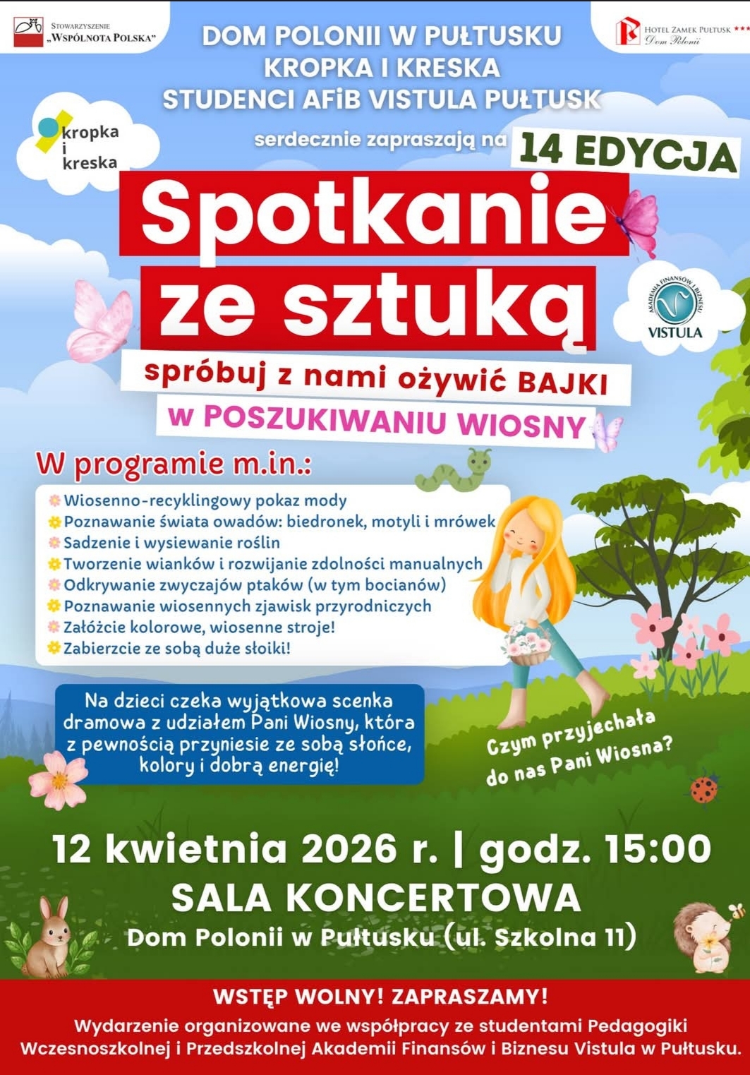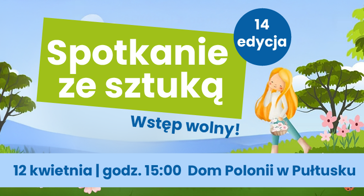 Już 12 kwietnia 2026 r. o godz. 15:00 w Sali Koncertowej Domu Polonii w Pułtusku odbędzie się 14. edycja „Spotkania ze sztuką” pod hasłem „Spróbuj z nami ożywić bajki – w poszukiwaniu wiosny”.