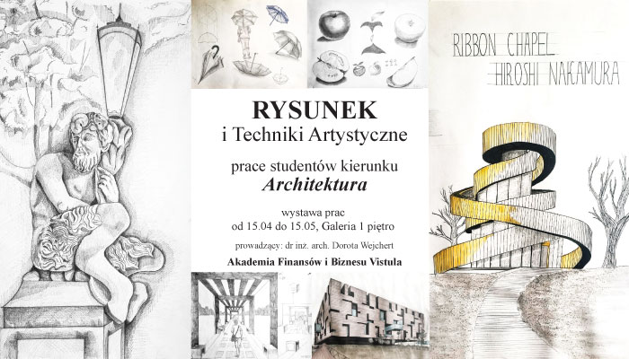Już od 15 kwietnia do 15 maja 2026 roku w Galerii na pierwszym piętrze Akademii Finansów i Biznesu Vistula przy ul. Stokłosy 3 w Warszawie będzie można oglądać wystawę prac studentów kierunku Architektura, przygotowaną w ramach przedmiotu „Rysunek i techniki artystyczne” prowadzonego przez dr inż. arch. Dorotę Wejchert na Wydziale Informatyki, Grafiki i Architektury.
